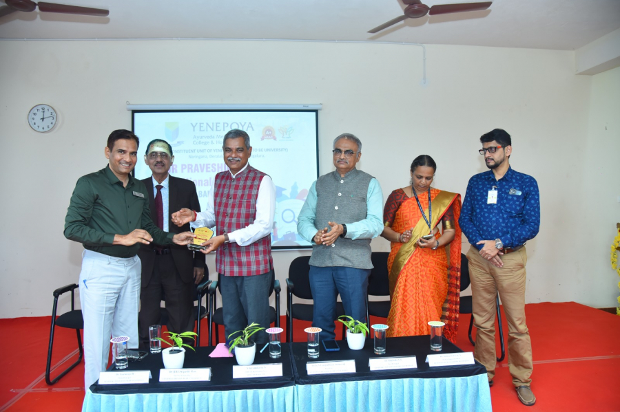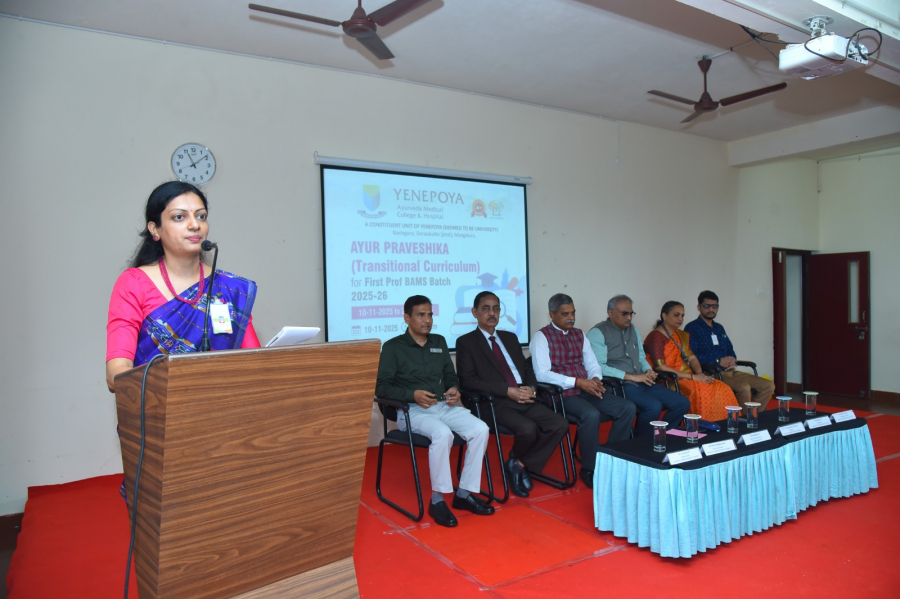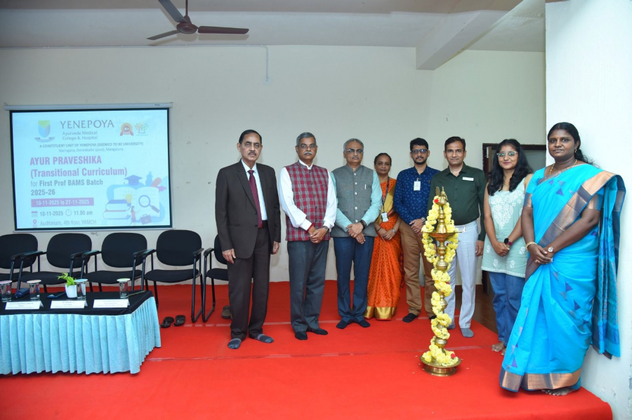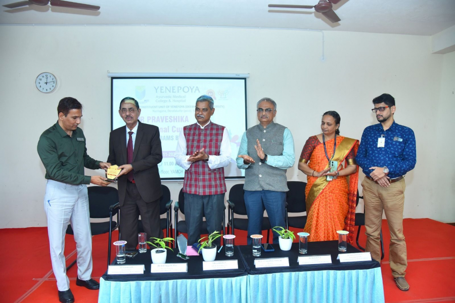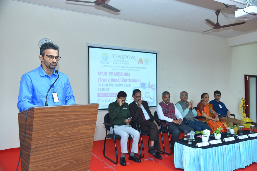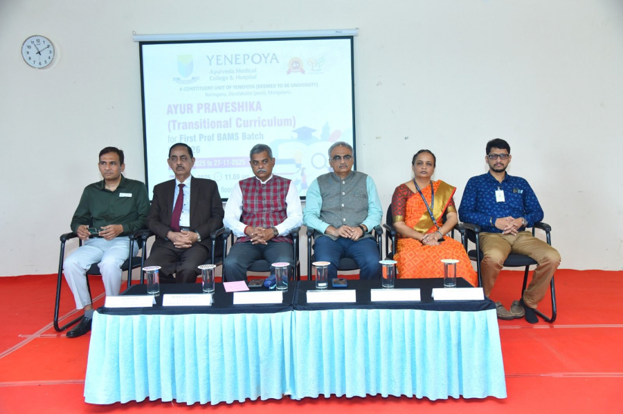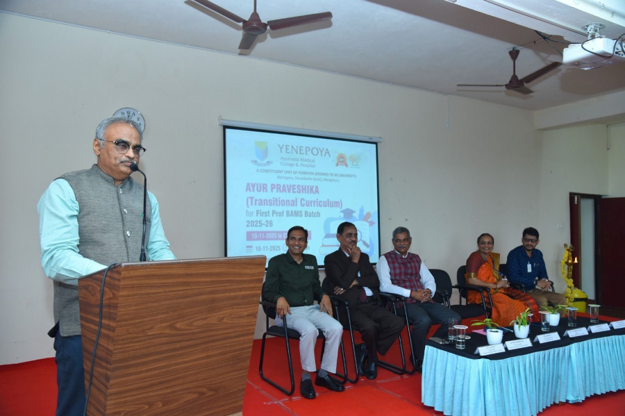 The Inaugural Ceremony of Ayur Praveshika 2025–26, the transitional curriculum for the First Professional BAMS batch, was held on 10th November 2025 at Yenepoya Ayurveda Medical College & Hospital, Naringana. Shri Vikramdatta S., CHEAR, Retd. Indian Navy, IPDG, RI District 3181, graced the occasion as the Chief Guest and Inaugurator. Dr. B.H. Sripathi Rao, Pro Vice-Chancellor, Yenepoya (Deemed to be University), Mangaluru, and Dr. Gangadhar Somayaji, Registrar, served as the Guests of Honour. Newly admitted students and their parents attended the ceremony, marking the formal commencement of the academic journey for the 2025–26 batch.